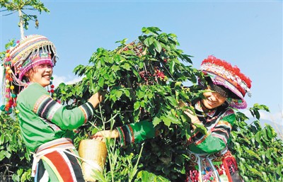 圖為咖農(nóng)在新寨萬畝咖啡示范園內(nèi)采摘咖啡豆。