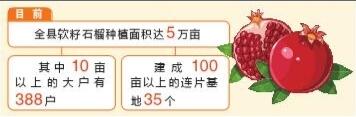 歷經(jīng)了10多年的選育、種植、示范,永勝縣的軟籽石榴產(chǎn)業(yè)已初具規(guī)模。目前,全縣軟籽石榴種植面積達(dá)5萬畝,其中種植面積在10畝以上的大戶有388戶,建成100畝以上的連片基地35個。