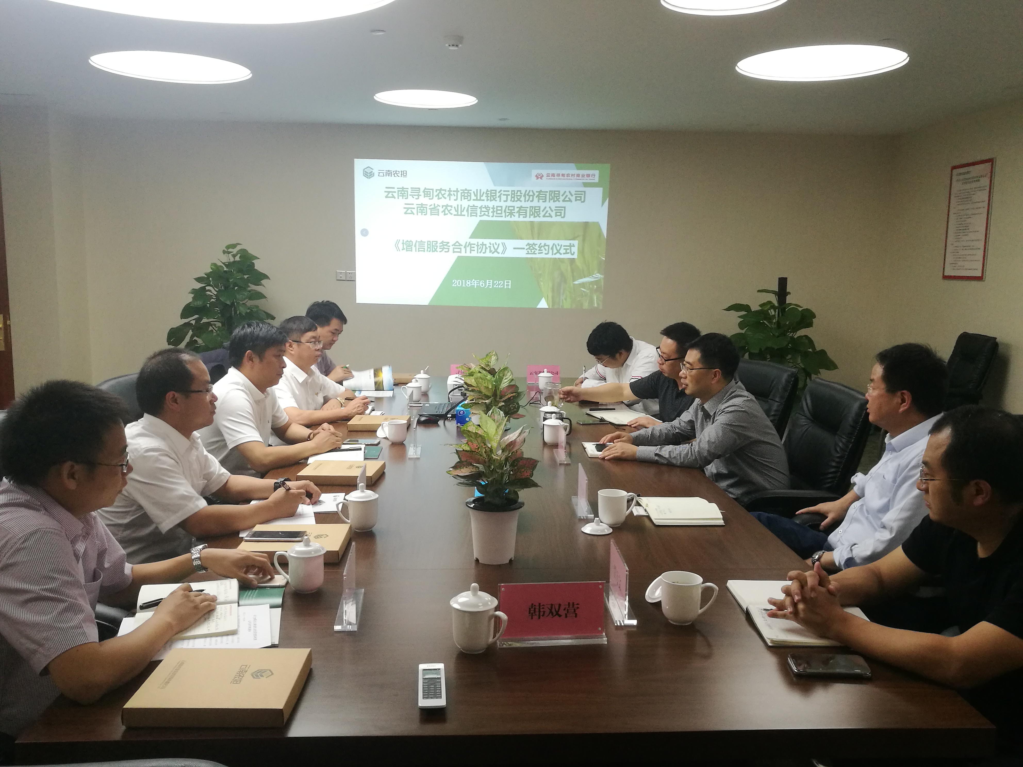 6月22日下午,為認(rèn)真貫徹落實(shí)《中共中央 國務(wù)院關(guān)于實(shí)施鄉(xiāng)村振興戰(zhàn)略的意見》(中發(fā)〔2018〕1號(hào))和省委、省政府關(guān)于發(fā)展“三農(nóng)"的決策部署,緊緊圍繞“一村一品、一縣一業(yè)”發(fā)展新格局,為緩解新型農(nóng)業(yè)經(jīng)營主體融資難、融資貴的問題,遵循合作共贏理念,整合各自優(yōu)勢,構(gòu)建銀擔(dān)聯(lián)合創(chuàng)新、聯(lián)合推動(dòng)、風(fēng)險(xiǎn)共擔(dān),省農(nóng)擔(dān)公司與尋甸縣農(nóng)村商業(yè)銀行本著互惠互利、讓利于農(nóng)的原則,由尋甸農(nóng)商行董事長虞燕林帶隊(duì)、行長李葉忠、副行長范彪等一行前往省農(nóng)擔(dān)公司與董事長郭影、總經(jīng)理杜開波、副總經(jīng)理廖寅皓、農(nóng)擔(dān)二部負(fù)責(zé)人賈萬文等進(jìn)行會(huì)談,會(huì)議期間雙方簽署了尋甸縣增信服務(wù)合作協(xié)議,為下一步業(yè)務(wù)開展打下了堅(jiān)實(shí)的基礎(chǔ)。