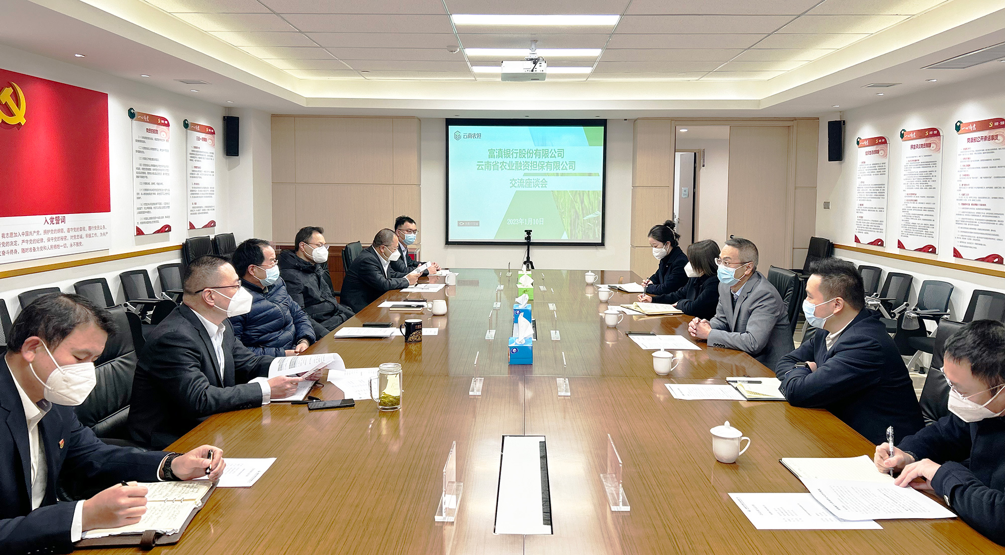2023年1月10日,云南省農(nóng)業(yè)融資擔(dān)保有限公司與富滇銀行股份有限公司召開銀擔(dān)合作座談會。富滇銀行黨委委員、副行長納然,公司董事長杜開波、總經(jīng)理李世偉、副總經(jīng)理廖寅皓出席會議。會議圍繞2023年雙方合作目標(biāo)展開討論,并就推進下一步戰(zhàn)略合作達成共識。