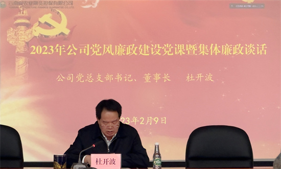 2月9日,云南省農(nóng)業(yè)融資擔(dān)保有限公黨總支部書(shū)記、董事長(zhǎng)杜開(kāi)波在公司年度工作會(huì)議上,為全體職工上了一堂黨風(fēng)廉政建設(shè)專(zhuān)題黨課,并作集體廉政談話。省公司全體職工、州市分支機(jī)構(gòu)負(fù)責(zé)人、主管等現(xiàn)場(chǎng)聽(tīng)課,各州市分支機(jī)構(gòu)全員通過(guò)視頻方式聽(tīng)課。