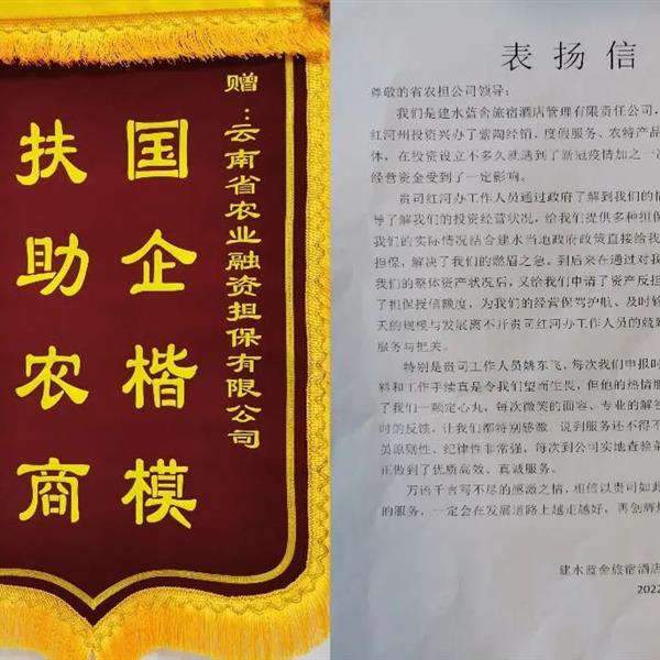 11月16日,云南省農業(yè)融資擔保有限公司收到擔??蛻艚ㄋ{舍旅宿酒店管理有限責任公司送來的一封表揚信和一面印有“國企楷模 扶助農商”的錦旗,表達對云南農擔公司...